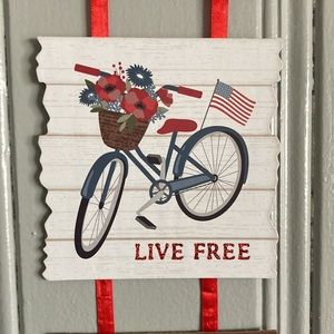 The second sign has a rustic white background and a beautiful navy bicycle with an American flag 🇺🇸 in the back with a basket full of beautiful summer flowers with glittered LIVE FREE sentiments
