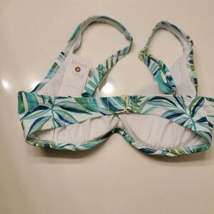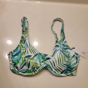 Nwt size 34 D medium vibrant bikini top with a tropical leaf print. Features shades of green and blue.