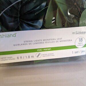 A fun set of 18 LED Monstera leaf string lights by Michael's Ashland brand. These lovely tropical leaves are pre-lit with LED lights and are perfect for adding to a floral or jungle Summer decor theme. This lush, leafy plant-themed set of lights are on a 6' long light string, takes 2AA batteries, and are new in box. A vibrant decor accessory for your Summer beach house :)