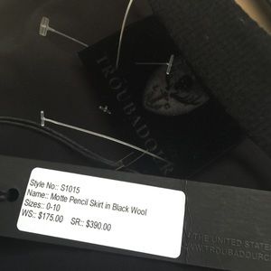 Elegant and unique troubadour bkack wool pencil skirt . Beautiful tailoring with side pocket and petal rounded hems. New with tags, fully lined, size 10. Waist 29" . Length 28"