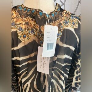 Brand NEW with TAGS True Colours by La Moda One Size Cat Animal Print Midi Length Caftan Dress or Top. Has jeweled embellishments, and tassels, and has a front lace up style. This is semi-sheer so a tank should be worn underneath unless wearing over a swimsuit.
