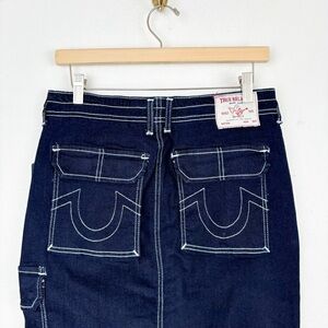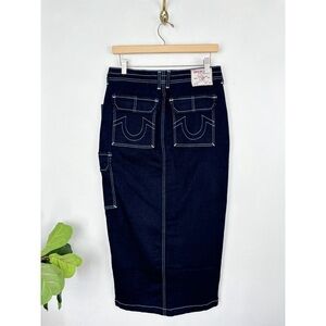 NWT True Religion Dark Wash Contrast Stitch Denim Cargo Slitted Maxi Skirt Sz 27