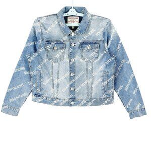 True Religion Women Light Wash Blue Allover Logo Relaxed Trucker Jacket Size XL