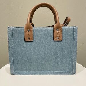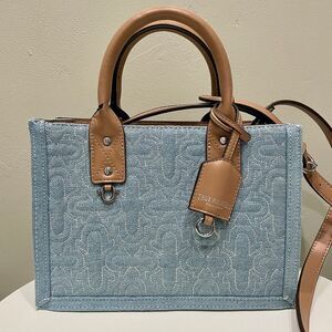 True Religion Quilted Denim Horseshoe Modern Tote Satchel Crossbody Bag in Light Blue