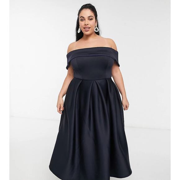 NWT True Violet Folded Bardot Prom Midi Dress Navy Blue UK 22 / US 18