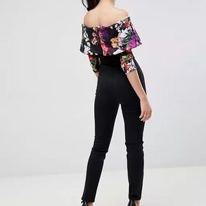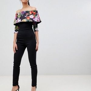 Amazing! Tight-fitting jumpsuit in black with floral print on the sleeves and fold-over bardot neckline. Brand new.