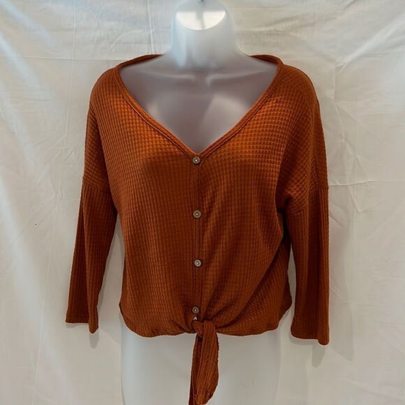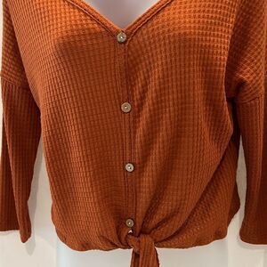 NWT Try ! This rust colored v neck decorative buttons ties at bottom. Midriff shirt.