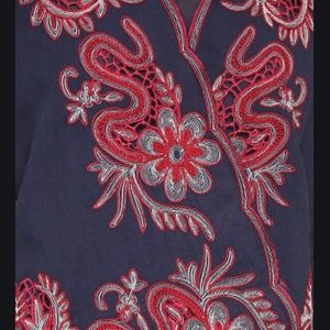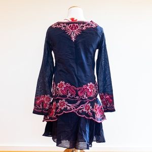 Elaborate embroidery and crochet lace lend a free-spirited feel to this airy voile TRYB212 dress. The surplice bodice lends a wrapped effect, and ruffles cross over at the covered elastic waist. Covered snap closure at V neckline. Long sleeves and button cuffs. Lined.
