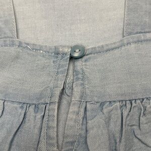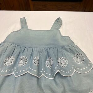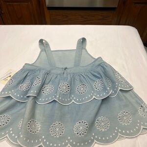 This top is just so cute! Made of a light weight, soft, denim look fabric. It is cool and lightweight. Empire styling top with two lower tier ruffles. Each ruffle has cutouts embroidered in white and the edges are scalloped. One button closure at back of neck but top can just pull on. It is adorable with shorts or skirts. By Tucker& Tate. Girls Sz. 8. Like new condition, no stains or damage. Purchased at Nordstrom. Original price $35.00. Purchased on sale for $27.00. Fun, contemporary and oh, so cute!