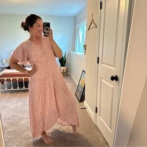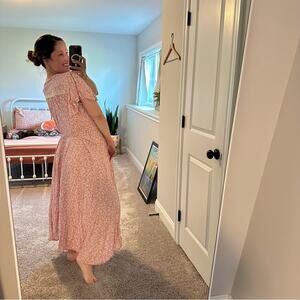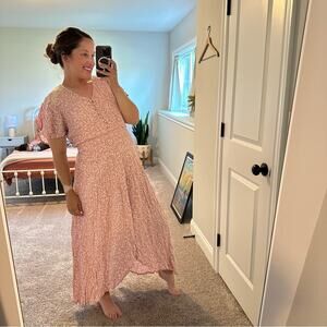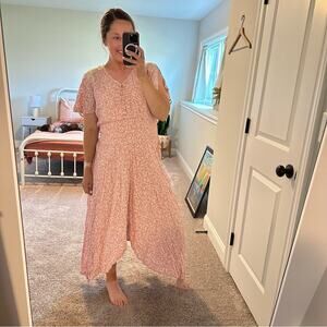 I adore this gorgeous new with tags designer Tuckernuck ELF handmade in Bali pink white floral printed lace button front short sleeve maxi dress with elastic smocked waist