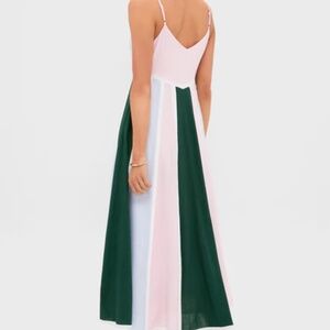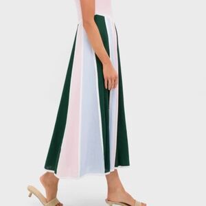 Beautiful new with tags never worn. This is an elegant midi dress with adjustable straps, a sweetheart neckline and whimsical seamed panels in baby pink, powder blue, forest green and white trim.