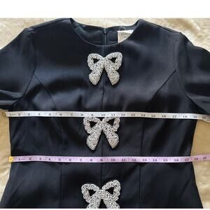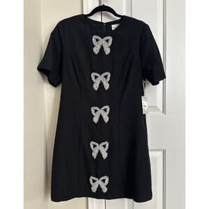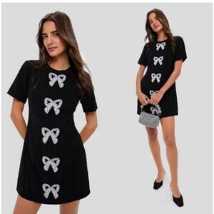 The Beaded Bows Bernadette Mini Dress is the perfect party dress! Featuring beaded bow detailing down the front and a classic silhouette, we chose to pair it with a sparkly clutch and black heels.
