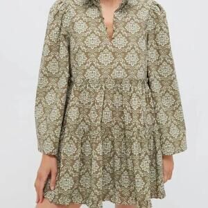 Tags: Tuckernuck Russell dress, Hyacinth House mini dress, Olive green floral dress, Moss cotton mini dress, Fall long sleeve dress, Casual cotton day dress, NWT, Tuckernuck size medium, Relaxed tiered mini dress, Garden party dress