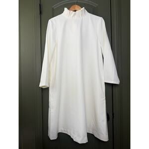 The Tuckernuck Daphne Dress is a timeless favorite with its signature ruffle stand collar and elegant bow-tie back. Made from soft stretch crepe, this swing mini combines sophistication and charm in one effortless silhouette. Perfect for holiday gatherings, cocktail parties, or brunch with friends, it’s a chic choice for any occasion. Features side pockets, a keyhole back, and three-quarter sleeves for a flattering, feminine finish.