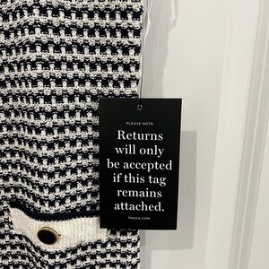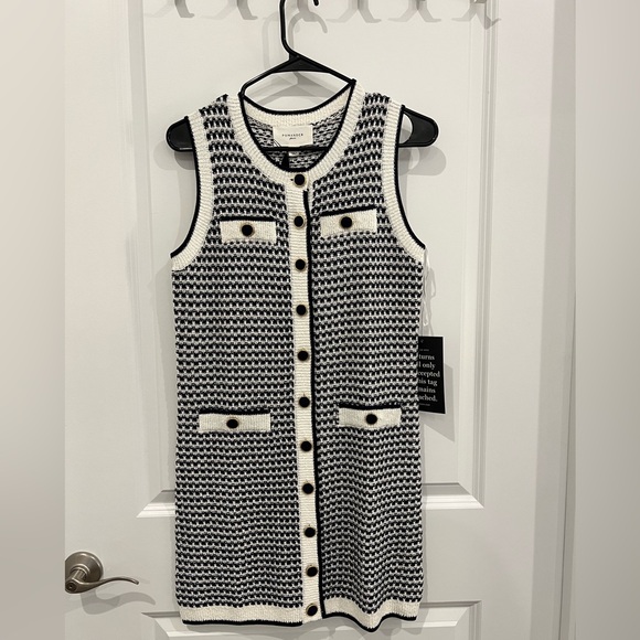 Chic knit midi dress by Pomander Place. Features a dark navy/black and white pattern with button accents. Sleeveless and stylish.