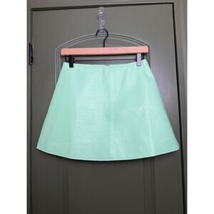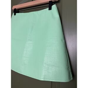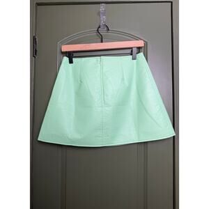 Add a pop of color to your spring wardrobe with the Mint Chip Leather Meg Mini Skirt. This flirty style boasts a straight, clean hem with a slight A-line silhouette and a textured fabric. Pair with a light sweater for breezy days, or with a blouse and sandals for a chic day-to-night look. Mid rise Back zip closure A-line silhouette Mini length Lined Crinkle-textured fabric Faux Leather