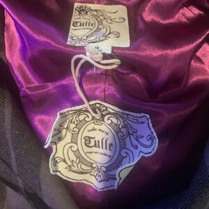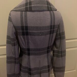 NWT Tulle by Anthropologie Plaid Wool Blend Jacket Size large. Wool blend peacoat. Two lined front pockets. The shell is wool and acrylic. It has pleated cuffs and double button upfront enclosure. Beautiful collar. Lined in purple polyester. Pleated slits in the back. 19 inches from pit to pit and 25 inches in length. Brand new!