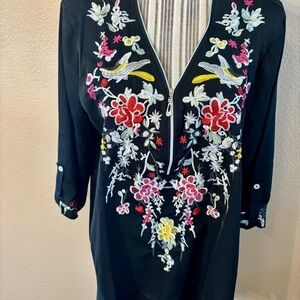 NWT Tunic Top Small Oversized Grosy Black Embroidered Floral Pink White Zip Neck