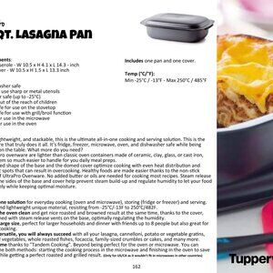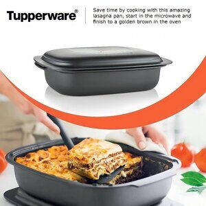NWT Tupperware UltraPro Lasagna Pan with Cover is super lightweight, microwave and oven safe, freezer safe and dishwasher safe and the best part is it's 2 pans in one. The cover can be used as a baking dish as well. Cook 2 different dishes at once also...Start in the microwave and finish in the oven or vice versa! Cleans effortlessly and such a time saver. Food stays hot longer too. Limited Lifetime warranty. BPA free.