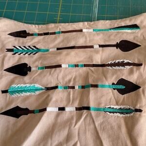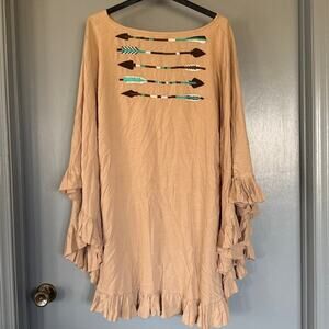 Pullover, oversized loose-fitting dress with western arrows across back. Ruffles around bottom and sleeves.
