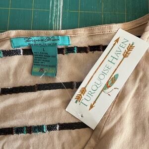 NWT Turquoise Haven Taupe Dress with Arrows and Ruffles V-Neck size Large
