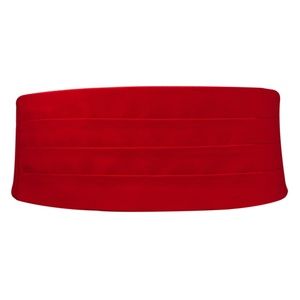 Fashioned from solid Red Polyester/Satin, this Cummerbund features a men's adjustable waist sizes Boys 22" to 28" Mens 28" - 48" Mens XL 46" to 70" with a rear hook closure.