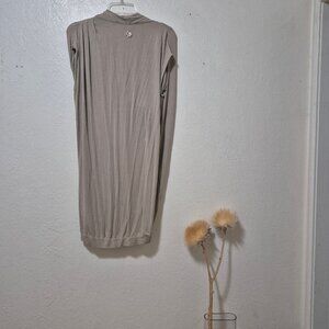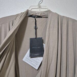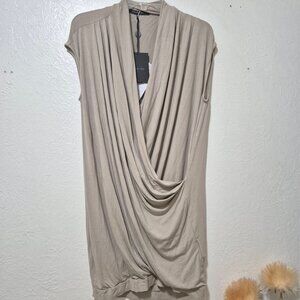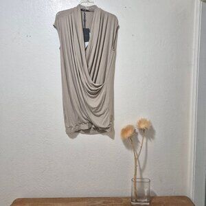 Drapey, comfy jersey dress from designer brand Twin Set. Really flattering, elegant draping. New with tags but I found a couple spots where, I don't know, maybe hanger damage? The material is just a little indented and slightly lighter; shown in photos. Banded hem. Sort of a cream-taupe color.
