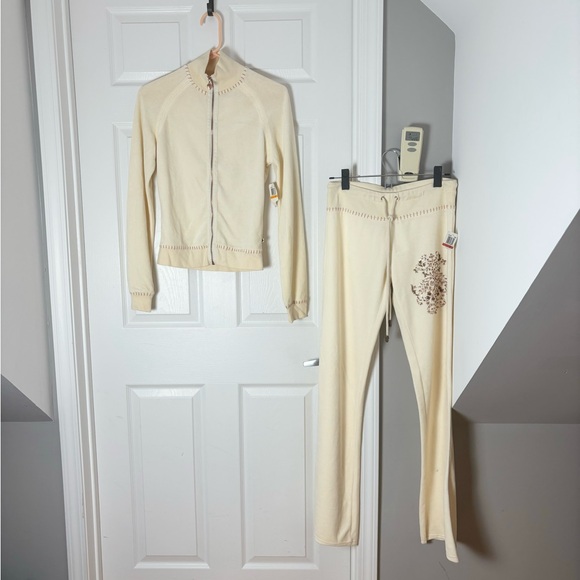 Tan / cream velour matching zip up hoodie sweatshirt and velour track pants