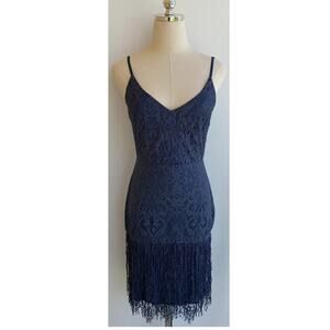 Two Sisters The Label SHIMMY Mini DRESS STEEL BLUE Tassel Hem V Neck US 2 XS. New with tags.