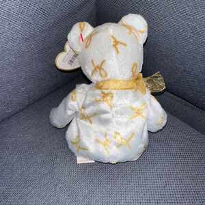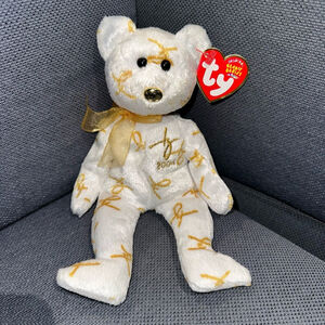 This Ty Beanie Baby is a white plush bear with gold ribbon accents and gold signature-style markings. It features a gold-colored nose and black eyes. The bear is approximately 6 inches tall and made of soft, plush material. It has a Ty heart-shaped tag attached, indicating it's an original Beanie Baby. The tag shows it's surface washable and made of polyester fiber and P.E. pellets. All materials appear new and undamaged. The item is in its original packaging.