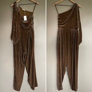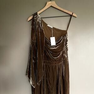 NEW WITH TAGS ULLA JOHNSON Tess Jumpsuit in Cub, Size 8, Moss Green Brown Color, Velvet, One Shoulder, Bow Detail, Playsuit, One Piece, Pantsuit, Blouson Fit