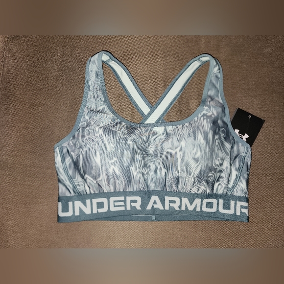 This is a brand new UNDER ARMOUR Mid Crossback Sports Bra in size Medium and with printed design in sage color. It has soft removable, quick-drying cups tailored for medium support activities like cycling, weight training, and boxing. The cups are labeled left and right and are perforated to give extra breathability. The crossover straps have an improved keyhole to allow easier on/off. The elastic band is soft and comfortable.
