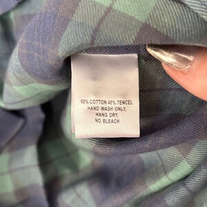 • Green/navy plaid, button front, long sleeves
