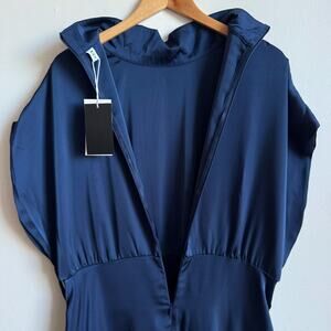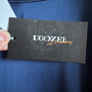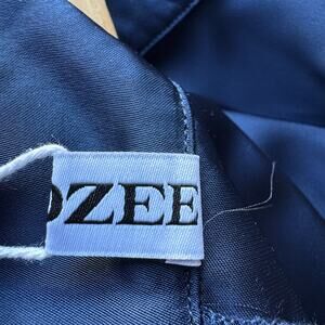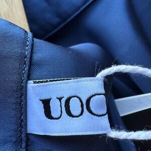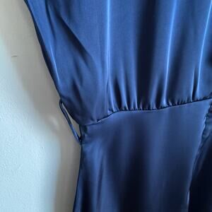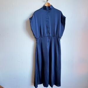 Details: UOOZEE blue silky wide shouldered sleeveless dress with mock neck, full skirt, belt loops (no belt included), and back zipper closure.