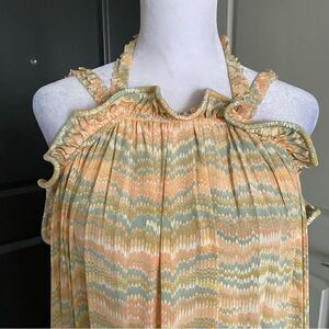 New with tags from luxury department store brand Ulla Johnson! The Celeste dress in Opal features a neutral multicolored wave pattern, high neck halter neckline with open back and ruffled detail, relaxed fit bodice, pockets, drop waist, ruffle hem and maxi length. Excellent brand new condition with an original price of $890!