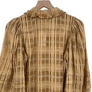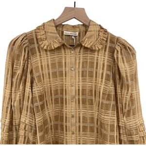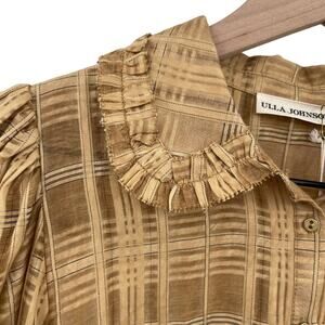 New with tags Ulla Johnson Circe Plaid Cotton-Silk Blouse in Chamomile, Size 0, Gold Yellow Tan Color, Ruffle Detail, Peter Pan Collar, Button Front, Button Down Top, Puff Sleeves, Long Sleeves, Blouson, Relaxed Fit