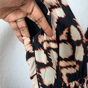 The Dephne Dress is made from silk taffeta printed in a graphic ikat-inspired stripe. This gorgeous cream and black dress features a midi-length ruffle skirt with bubble-edged tiers reminiscent of peony petals. It has a deep V-neckline and side-seam zipper.