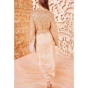 An exquisite statement layer, the Sylvan Coat is crafted from an impeccably soft, faux fur knit that's coated with a painterly gold foil. This long-sleeve overcoat has an elongated silhouette, long sleeves and a removable belt that cinches the waist.