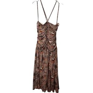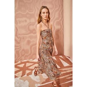 Ulla Johnson Marcella Midi Dress Wheat Flower. The Marcella Dress is crafted from our wild hibiscus print, in colors of beige, rust and light pink. Made from our tissue-thin cotton jersey, this body-skimming maxi dress is defined by its halter neckline, its ruched center seam, and full, beautifully gathered skirt.