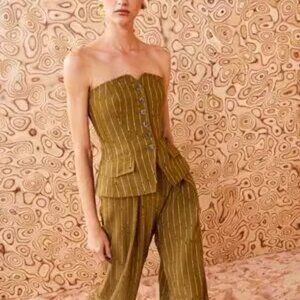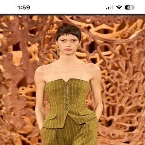 A key silhouette from Look 31 of our Autumn/Winter 2024 runway, the Noemie Top is masterfully tailored from Italian wool suiting with classic pinstripes and a slightly slubbed texture. Blurring the line between menswear and womenswear, this green strapless top nips in at the waist, has side pockets, and features a button front closure that beautifully details the silhouette. It has an internal bustier with a zipper, creating a secure and flattering fit. Composition: 90% Wool, 3% Polyester, 3% Cotton, 2% Viscose, 2% Elastane Pair with our Sylvie Pant, Tamar Stud & Zayin Earring Mix Set, and Fiona Loafer Heel to complete the look. Explore more in our Striped Wool Suiting collection. Women's Striped Noemie Top in Aspen