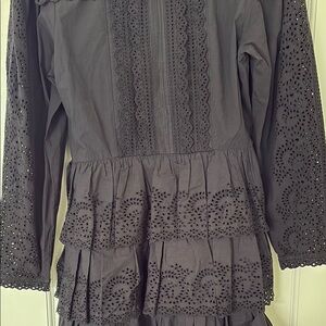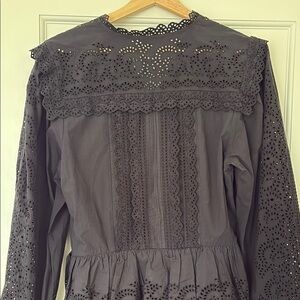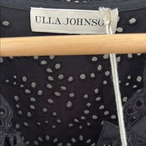 The Ulla Johnson Aster Eyelet Mini Dress in Black Cotton is a romantic yet modern piece, crafted from breathable cotton-poplin and adorned with delicate broderie anglaise detailing. Its tiered silhouette cinches at the waist, creating a flattering, feminine shape that moves gracefully with each step. This versatile dress can be dressed up or down, making it suitable for various occasions.