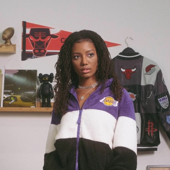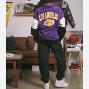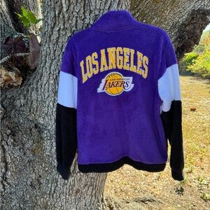 NWT Super soft Los Angeles Lakers full zip Sherpa jacket with logo on back and front.Purple black and white.Size L . Fanatic . L.A. . Cozy . Fuzzy . Soft . Sporty . Streetwear . Loungewear . Game Day