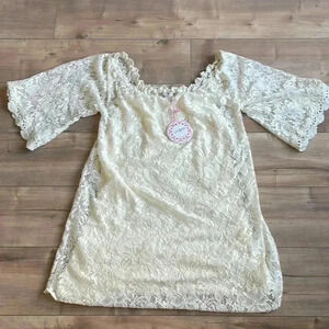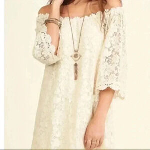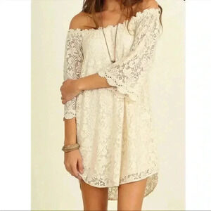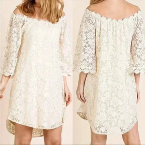 NWT Umgee Boho Ivory Babydoll Mini Dress Floral Crochet Lace Off Shoulder Sz S