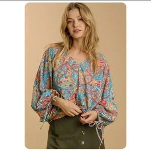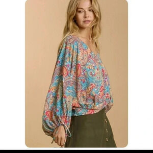 NWT Umgee Multicolored Paisley Print Long Balloon Puff Sleeve V-Neck Blouse(S)