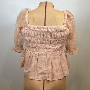 NWT Umgee Pastel Pink Rushed Bodice Sheer Floral Sleeve Blouse - Size Small