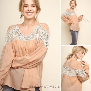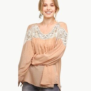 NWT Umgee Women's Floral Lace & Polka Dot Long Puff Sleeve Top Sz Small, Peach