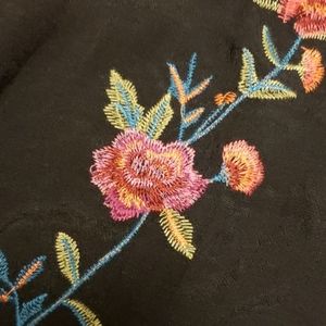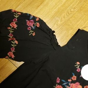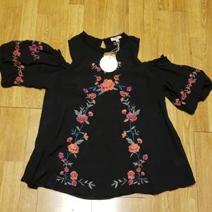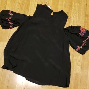 Black top with puff sleeves and cold shoulder. Keyhole in back. Sleeves and front have pink embroidered roses. NWT. Gauzy boho style. 21 inches pit to pit. Perfect festival top with cut offs.