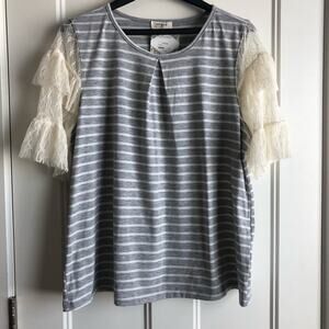 Umgee stripe grey and ivory t-shirt with ruffle lace sleeves
