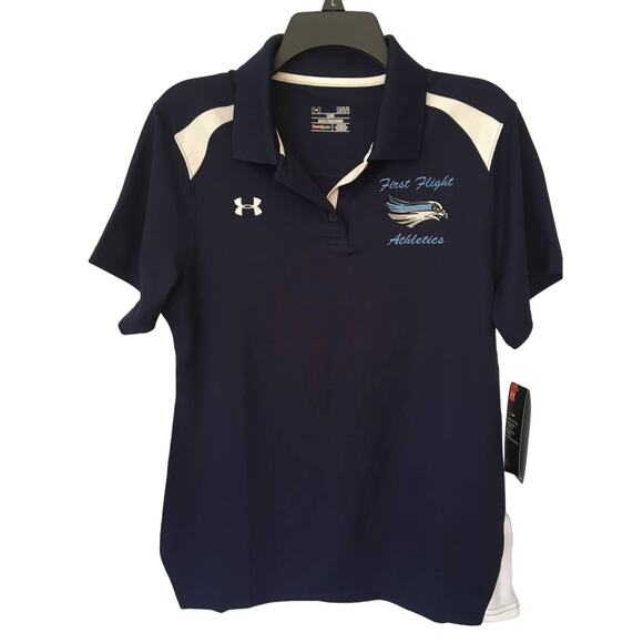 NWT Under Armour first flight athletics "Kitty Hawk North Carolina" women’s large heat gear Loose. Navy blue with white trim Bath is a half inch longer than 1 inch side slit. 94% polyester 6% elastane.