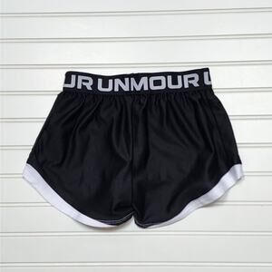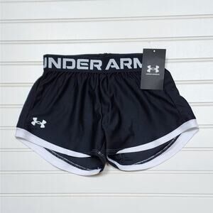 NWT Under Armour Girls Play Up 2.0 Shorts, size YSM, black and white.